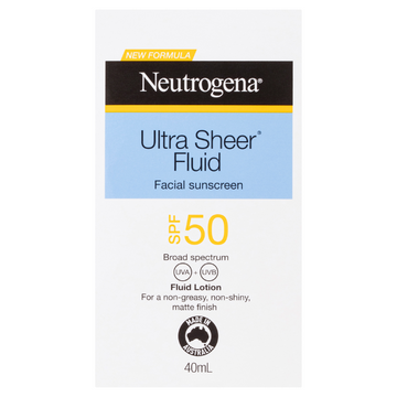 Neutrogena® Ultra Sheer Fluid facial sunscreen provides high SPF 50 broad-spectrum UVA/UVB protection against skin...