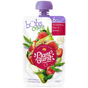 Succulent organic strawberries and pears are blended with protein-packed quinoa, then packed in a grab...