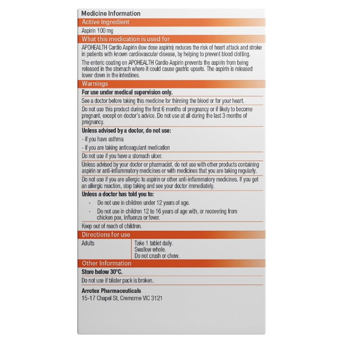 APO HEALTH Cardio Aspirin 100mg Blister Pack 28 Tablets