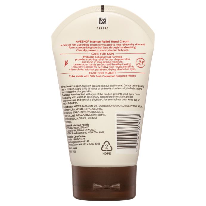 - What it doesAveeno Intense Relief Hand Cream is a rich yet fast-absorbing cream formulated to help relieve dry skin and form a protective glove that lasts through handwashing. Clinically proven to moisturise for 24 hours. Prebiotic Colloidal Oat Formula provides soothing relief for dry, chapped skin and locks in long-lasting moisture. leaves your hands smooth and healthy-looking.