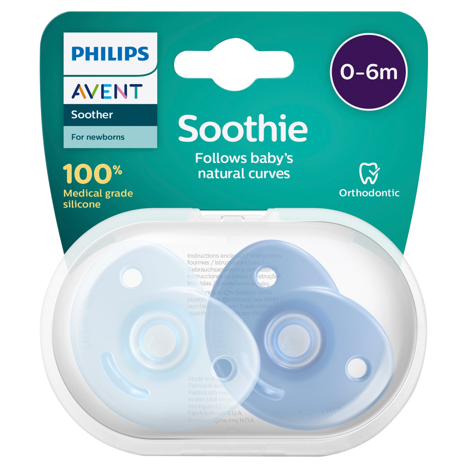 Phillips Avent Soothie promotes natural suckling for newborn babies till 6 months old. Its unique shape lets you place your finger in the nipple so you can bond with your baby by helping them suckle. The Philips Avent Soothie Shapes pacifier gives you an additional way to bond with your little one as our unique one piece design lets you give the comfort of your finger. The silicone nipple has a symmetrical shape that respects your baby's palate, teeth and gums as they grow. This pacifier is made of durable, yet flexible, medical grade silicone.