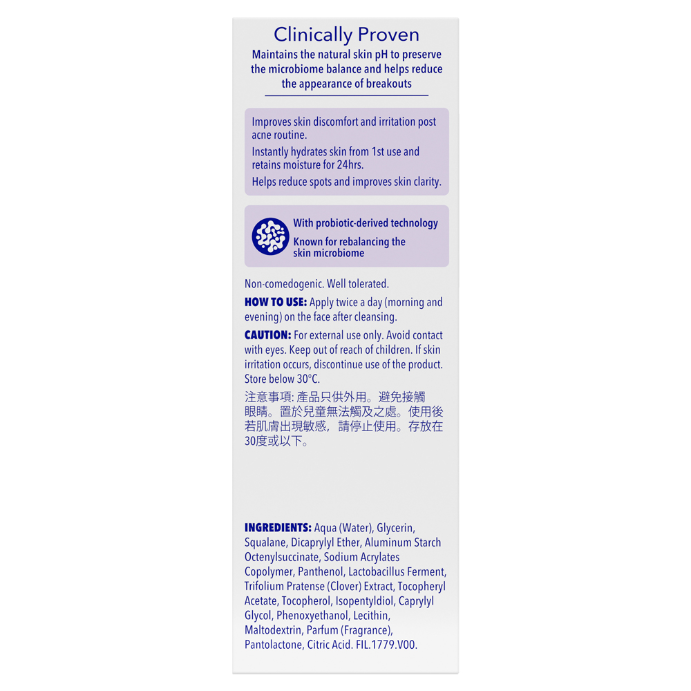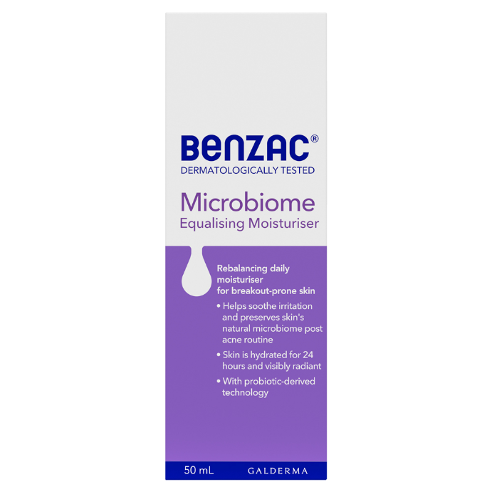- What it doesBenzac Microbiome Equalising Moisturiser is a rebalancing daily moisturiser for breakout-prone skin, specially developed to soothe skin irritation and discomfort, instantly hydrate and retain moisture for 24 hours. With probiotic-derived technology, this non-comedogenic moisturiser maintains the skin's natural pH to help preserve its microbiome and reduce the appearance of spots. Use as the final step in your three-step acne-fighting skin care routine.