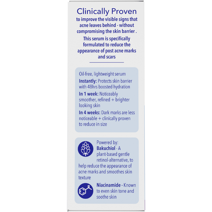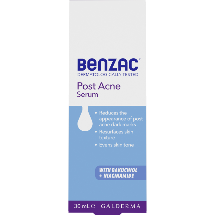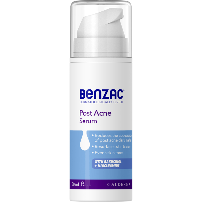 - What it isBenzac® Post Acne Serum is clinically proven to improve the visible signs that acne leaves behind. Formulated with a gentle plant-based retinol-alternative bakuchiol and niacinamide, this oil-free, lightweight serum smoothes skin texture and evens skin tone while protecting the natural moisture barrier. Dermatologically tested and suitable for everyday use.
