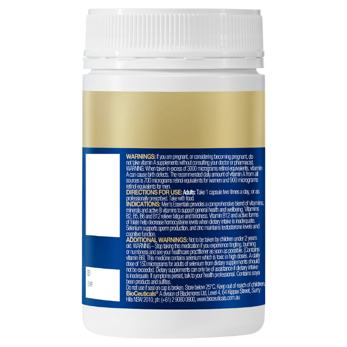 Stop taking this product if you experience tingling, burning or numbness and see your healthcare practitioner as soon as possible. [Contains vitamin B6].This medicine contains selenium which is toxic in high doses. A daily dose of 150 micrograms for adults of selenium from dietary supplements should not be exceeded. - What it isMen's Essentials provides a comprehensive blend of vitamins, minerals and active B vitamins and supports general health and wellbeing. Vitamins B2, B3, B5, B6 and B12 relieve stress and fatigue. Vitamin C, D and Zinc support healthy immune system function. Selenium supports sperm production, and zinc maintains testosterone levels and cognitive function.