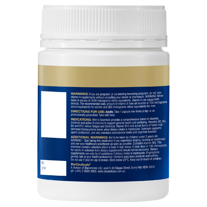 Stop taking this product if you experience tingling, burning or numbness and see your healthcare practitioner as soon as possible. [Contains vitamin B6].This medicine contains selenium which is toxic in high doses. A daily dose of 150 micrograms for adults of selenium from dietary supplements should not be exceeded. - What it isMen's Essentials provides a comprehensive blend of vitamins, minerals and active B vitamins and supports general health and wellbeing. Vitamins B2, B3, B5, B6 and B12 relieve stress and fatigue. Vitamin C, D and Zinc support healthy immune system function. Selenium supports sperm production, and zinc maintains testosterone levels and cognitive function.