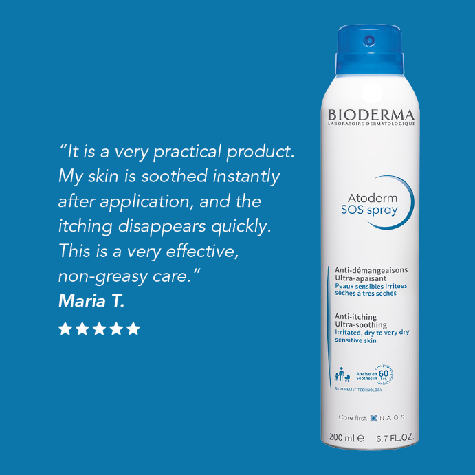 A BIODERMA innovation, Atoderm SOS Spray soothes the sensations that lead to skin scratching. Formulated in an easy-to-use 360° spray bottle, SOS Spray helps soothe the urge to scratch quickly and easily for all types of itching.