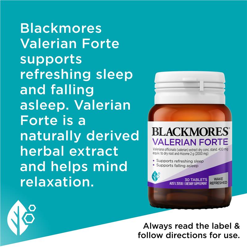 Blackmores Valerian Forte supports refreshing sleep and falling asleep. Blackmores Valerian Forte is a naturally derived herbal extract and helps mind relaxation.Blackmores Valerian Forte is a one-a-day dose of valerian which helps reduce time to fall asleep and supports refreshing sleep. It also reduces restless sleep and helps mind relaxation.