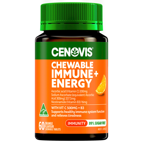 - What it isCenovis® Chewable Immune + Energy contains Vitamin C 500mg + Vitamin B3 in a great tasting, orange flavoured chewable tablet that is 99% sugar free.