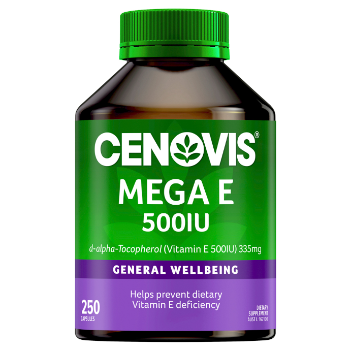 - Cenovis® Mega E 500IU supports general health and wellbeing. This product contains naturally derived Vitamin E.