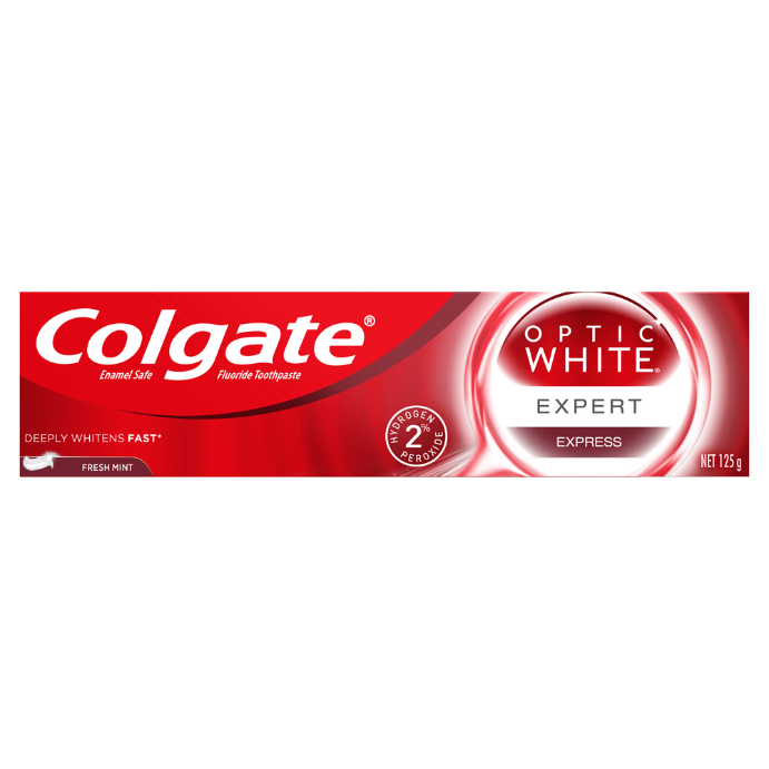 - What it isColgate Optic White Express White is Colgate's fastest whitening toothpaste. Offering whiter teeth in 3 days just by brushing, Colgate Optic White Express White goes beyond surface stain removal to deeply whiten teeth.