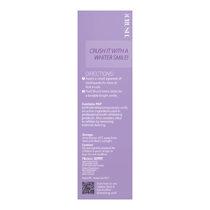 What it doesCrush your daily brushing routine with Piksters® CRUSH® Passionfruit & Peach Whitening Toothpaste. With each brush, enjoy a burst of flavoured freshness combined with essential fluoride (1450ppm) and PAP, an active ingredient used in professional teeth whitening products.