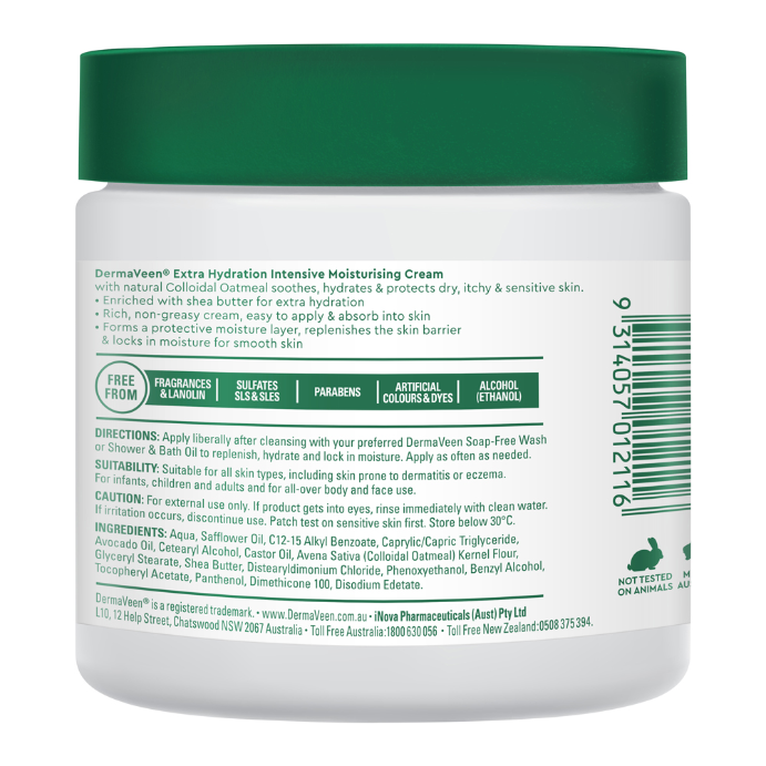 What it doesDermaVeen® Extra Hydration Intensive Moisturising Cream with natural Colloidal Oatmeal soothes, hydrates and protects dry, itchy and sensitive skin.