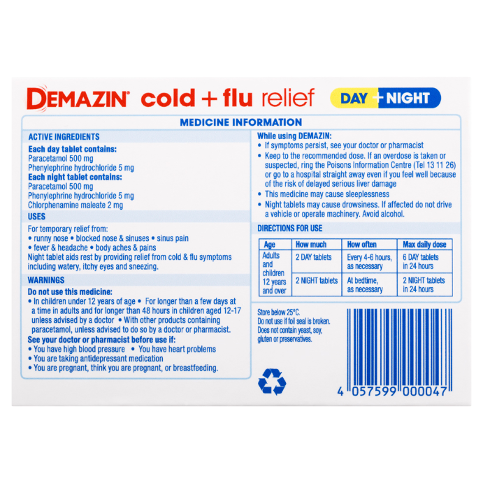 - What it isDemazin Cold & Flu Relief Day/Night Tablets provide temporary around-the-clock, multi-action relief from blocked or runny nose, sinus pain, fever, headache and body aches.