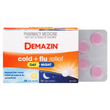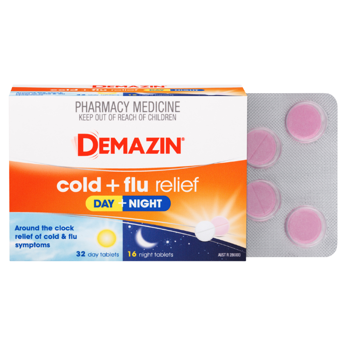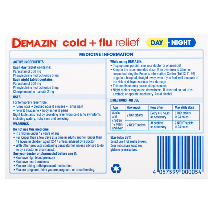 - What it isDemazin Cold & Flu Relief Day/Night Tablets provide temporary around-the-clock, multi-action relief from blocked or runny nose, sinus pain, fever, headache and body aches.