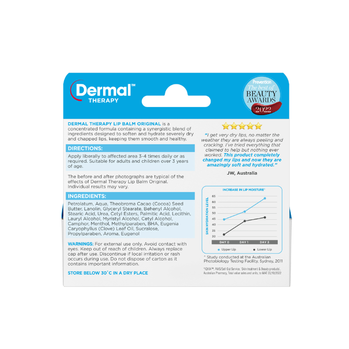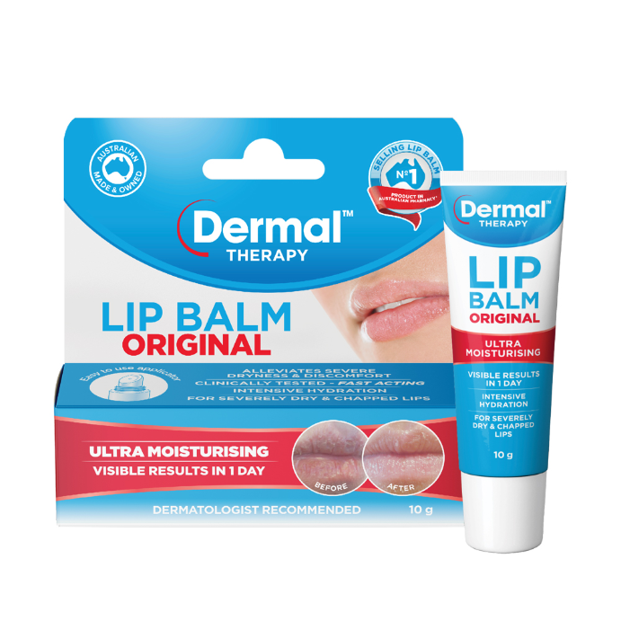 - What it isDermal Therapy Lip Balm is ultra-moisturising and alleviates severe dryness and discomfort while it hydrates and softens severely dry and chapped lips. Visible results in 1 day! Recommended by Dermatologists Australia wide.