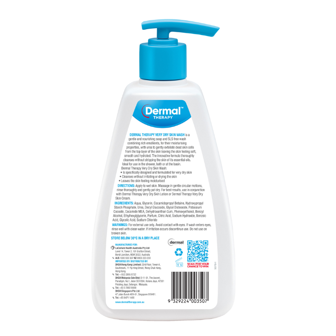- What it isDermal Therapy Very Dry Skin Wash is a nourishing soap free wash designed to cleanse, hydrate and soften very dry skin.