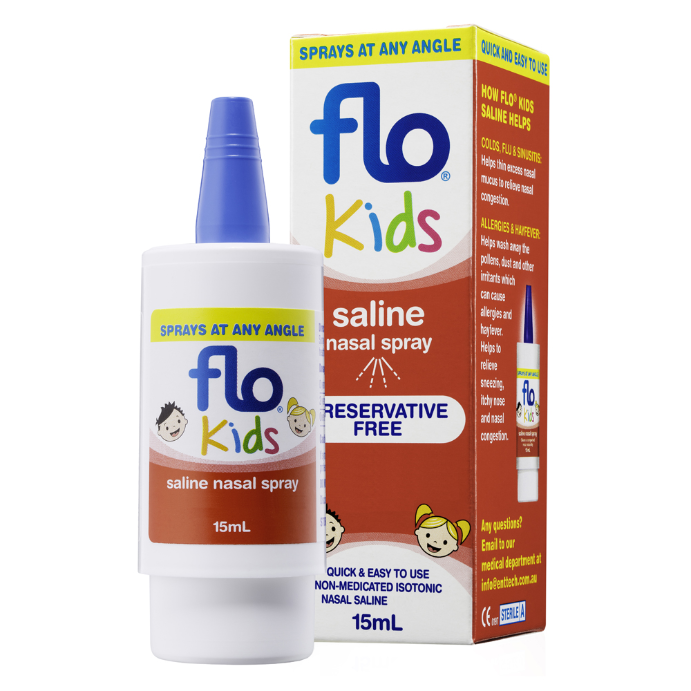 - What it isFlo Kids Saline Spray helps to clear a child's congested nose quickly, effectively and gently. It is a sterile, non-medicated, preservative-free, isotonic nasal saline solution (micromist spray) for toddlers and children. Flo Kids Saline Nasal Sprays are special because they can be sprayed AT ANY ANGLE making administration easier and hassle-free for parents and/or children. If a child's sleep is disrupted by a blocked or congested nose, parents may find using Flo Kids Saline may improve sleep. Sharing of a nasal spray device is not recommended due to risk of possible infection.