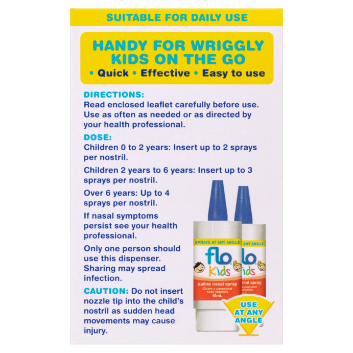 FLO Kids Saline is easy to use and can spray at any angle, so children can even administer it themselves! Always supervise children when administering a nasal spray and correct them if and when necessary. - What else you need to knowGentle, preservative-free nasal saline, suitable for daily use. Easy to use at any angle. Clears congestion in a natural way.