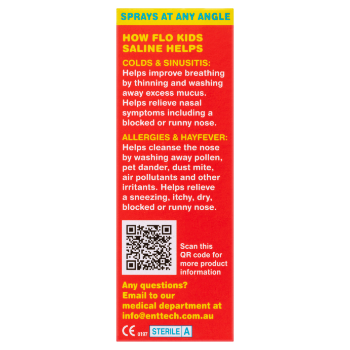 Using FLO Kids Saline Nasal Spray can help relieve a child's nasal symptoms due to colds and allergies as it can wash away mucus produced by colds, pollens, dust and other allergy-causing particles.