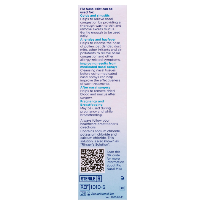 Store below 30°C. - What it isFLO Nasal Mist is a preservative-free, non-medicated nasal mist that delivers a gentle continuous spray to thin and clear nasal congestion naturally. It is gentle enough to be used daily.