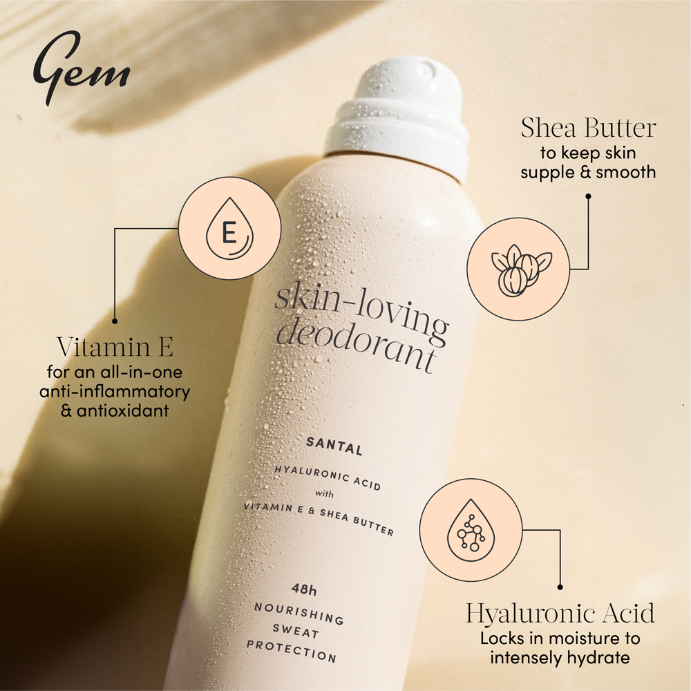 - What it isOur skin-loving formulation is enriched with premium ingredients like Hyaluronic Acid, Shea Butter and Vitamin E. We're super gentle on skin, but tough on sweat, so you can feel fresh, dry and primed to make everyday amazing. Available in four, flavour-filled scents - Santal, Coconut Vanilla, Vanilla Macadamia and Cool Fresh.