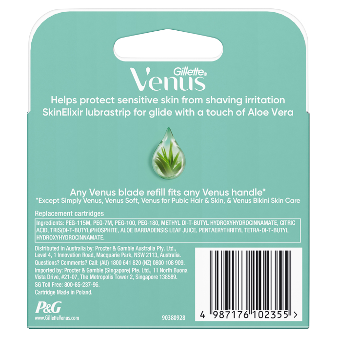 SkinCushion lubrication strip with Aloe Vera that helps protect you sensitive skin against shaving irritation. The SkinCushion lubrastrip activates when wet, providing your sensitive skin with a perfect dose of protection from nicks, cuts and irritation while shaving. These blade refills for women also feature a pivoting head that adjusts to your curves, including ankles and knees. No awkwardly angling your razor. Just use and replace when you're ready for a new one Gillette Venus female razor blades are designed with a woman's body in mind.