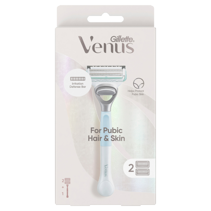 - What it doesGillette Venus's pubic hair and skin razor is specifically designed to help protect pubic skin from shave irritation. Its patented Irritation Defense Bar and optimally spaced blades allow the blades to cut hair while barely touching the skin. Also, the razor refills come equipped with a precision trimmer on the back of the blades to help with tricky areas.