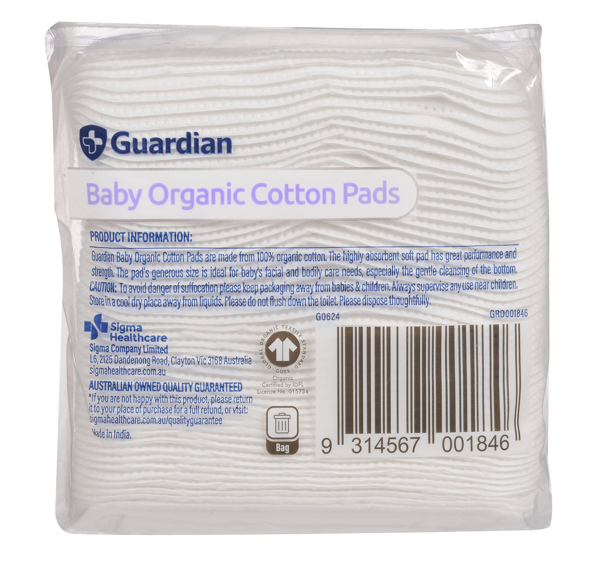 Guardian Baby Organic Cotton Pads are made from 100% organic cotton. The highly absorbent soft pad has great performance and strength.