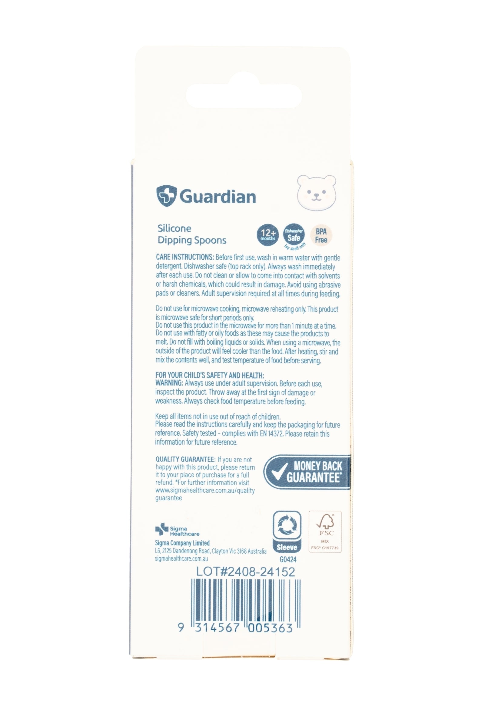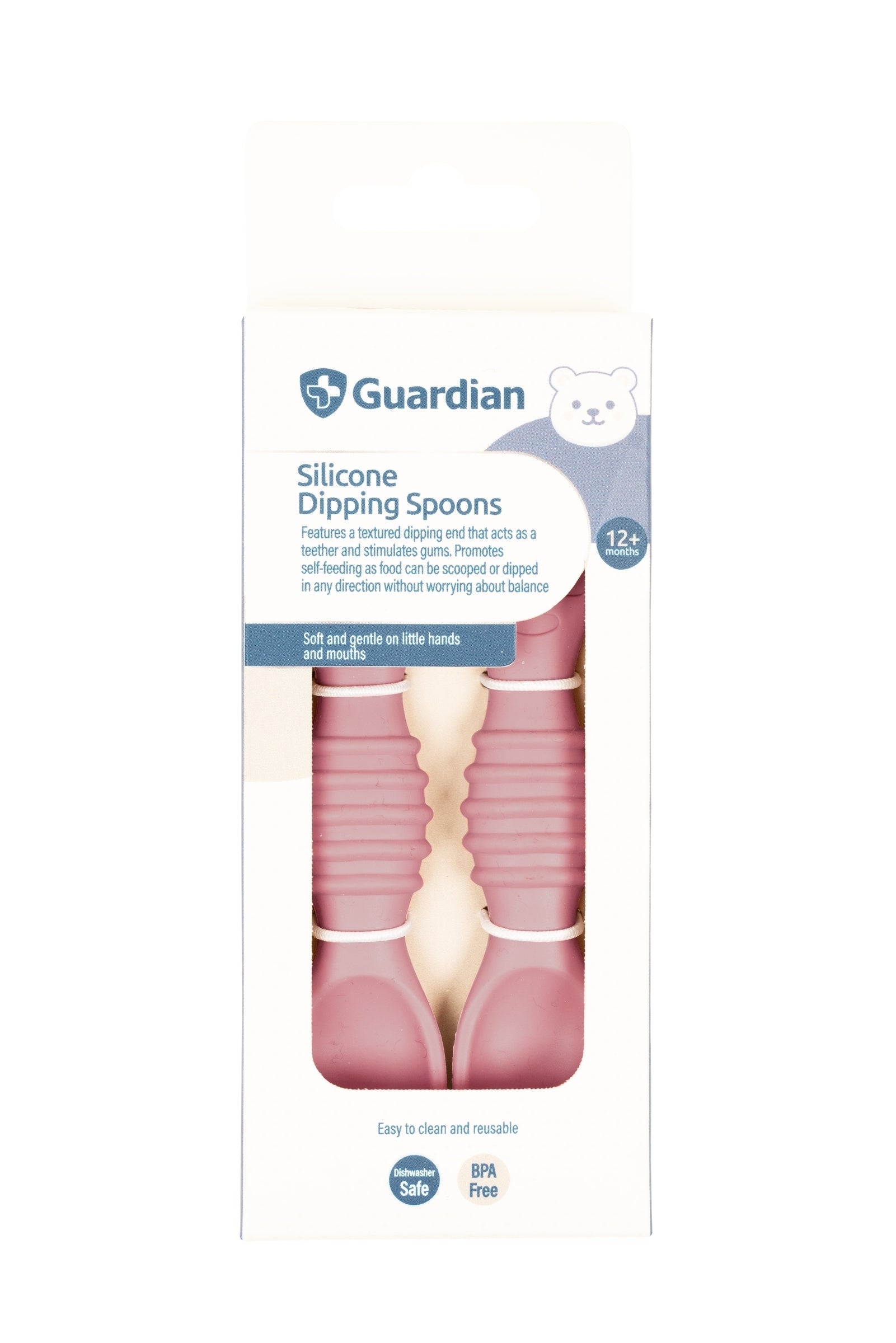 Guardian Silicone Dipping Spoons, features a textured dipping end that acts as a teether and stimulates gums. Promotes self-feeding as food can be scooped or dipped in any direction without worrying about balance.