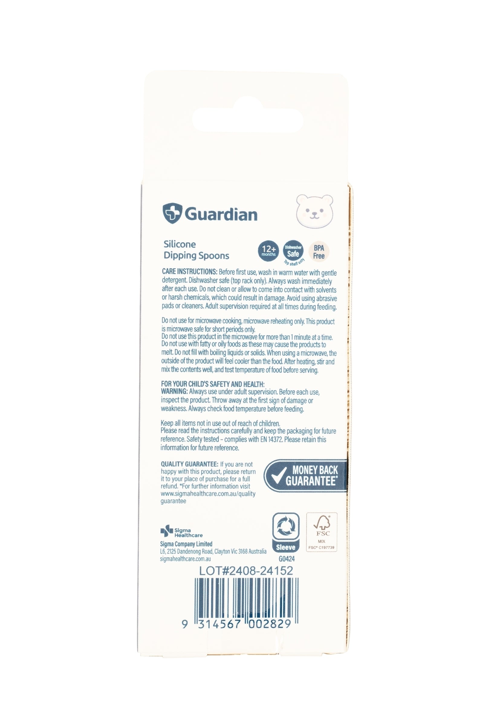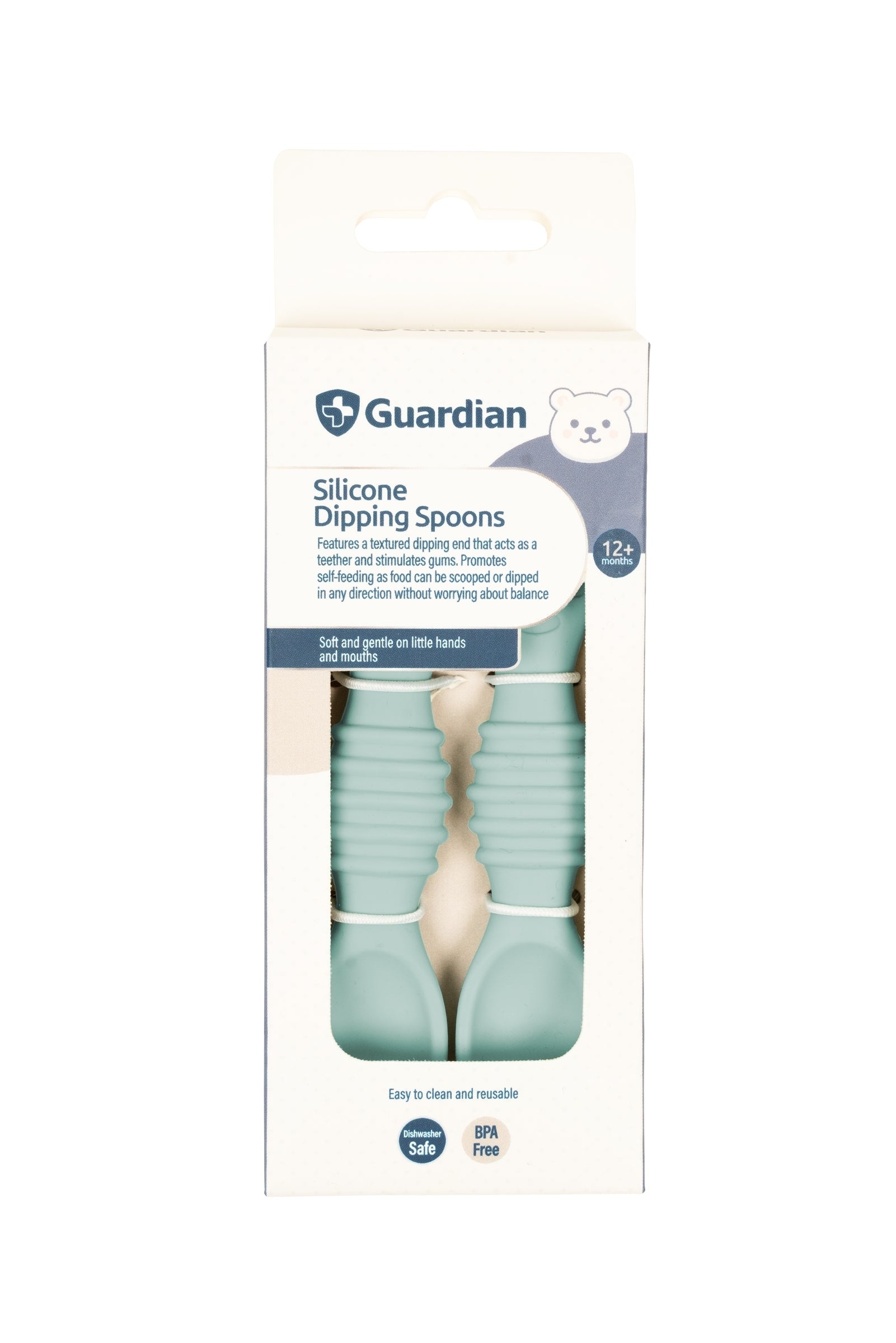Guardian Silicone Dipping Spoons, features a textured dipping end that acts as a teether and stimulates gums. Promotes self-feeding as food can be scooped or dipped in any direction without worrying about balance.