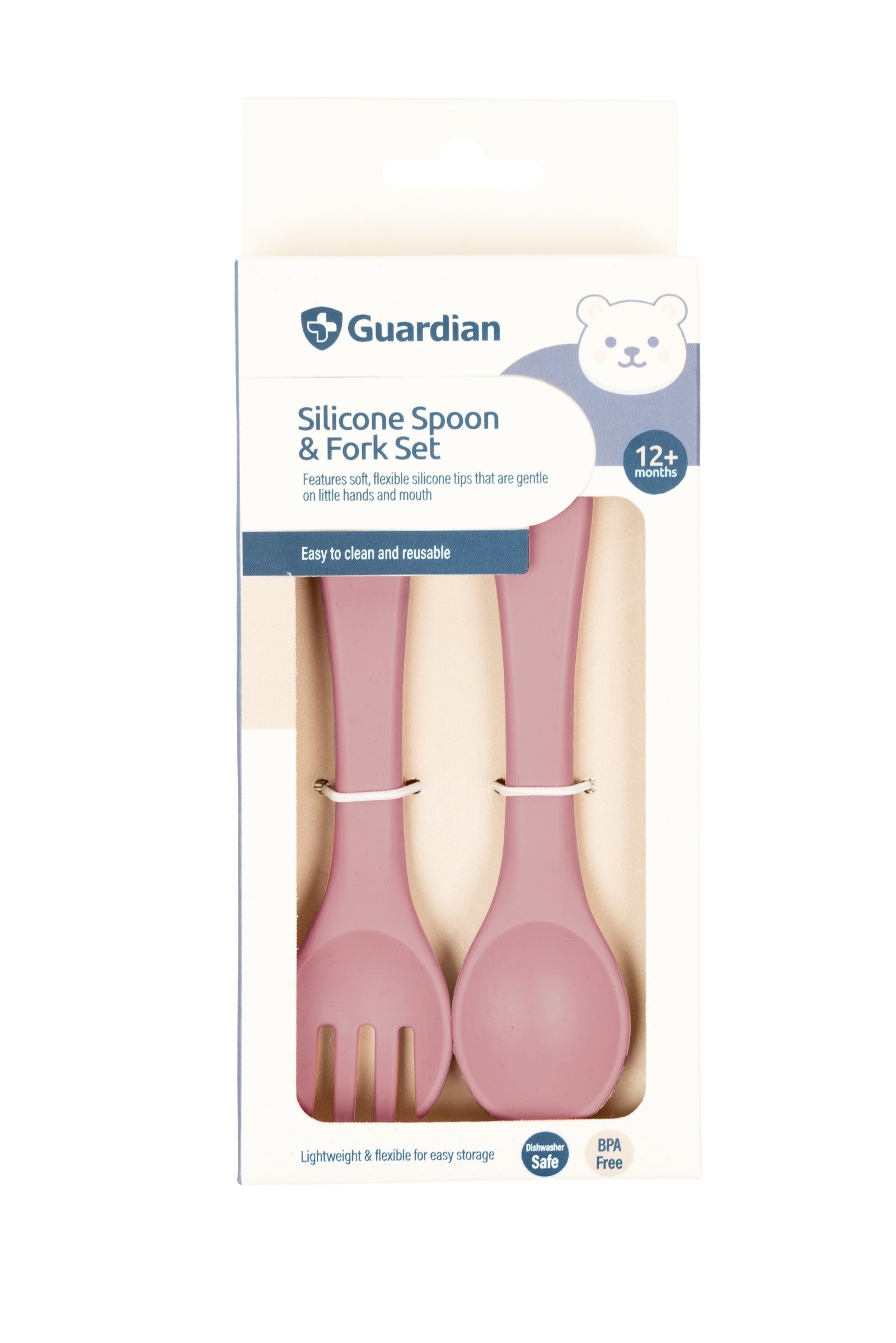 Guardian Silicone Spoon & Fork Set, features soft, flexible silicone tips that are gentle on little hands and mouth.