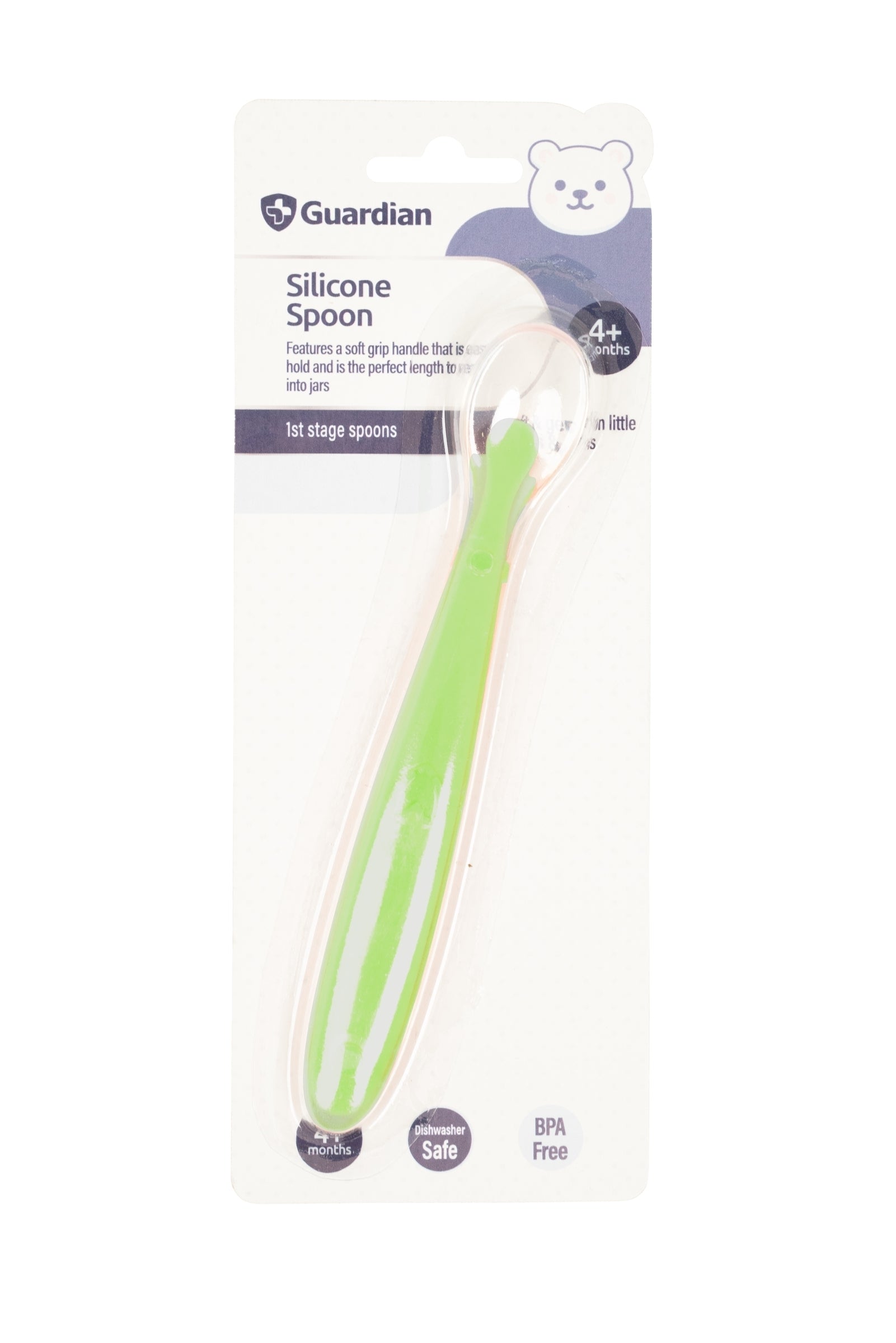 Guardian Silicone Spoon, features a soft grip handle that is easy to hold and is the perfect length to reach into jars.