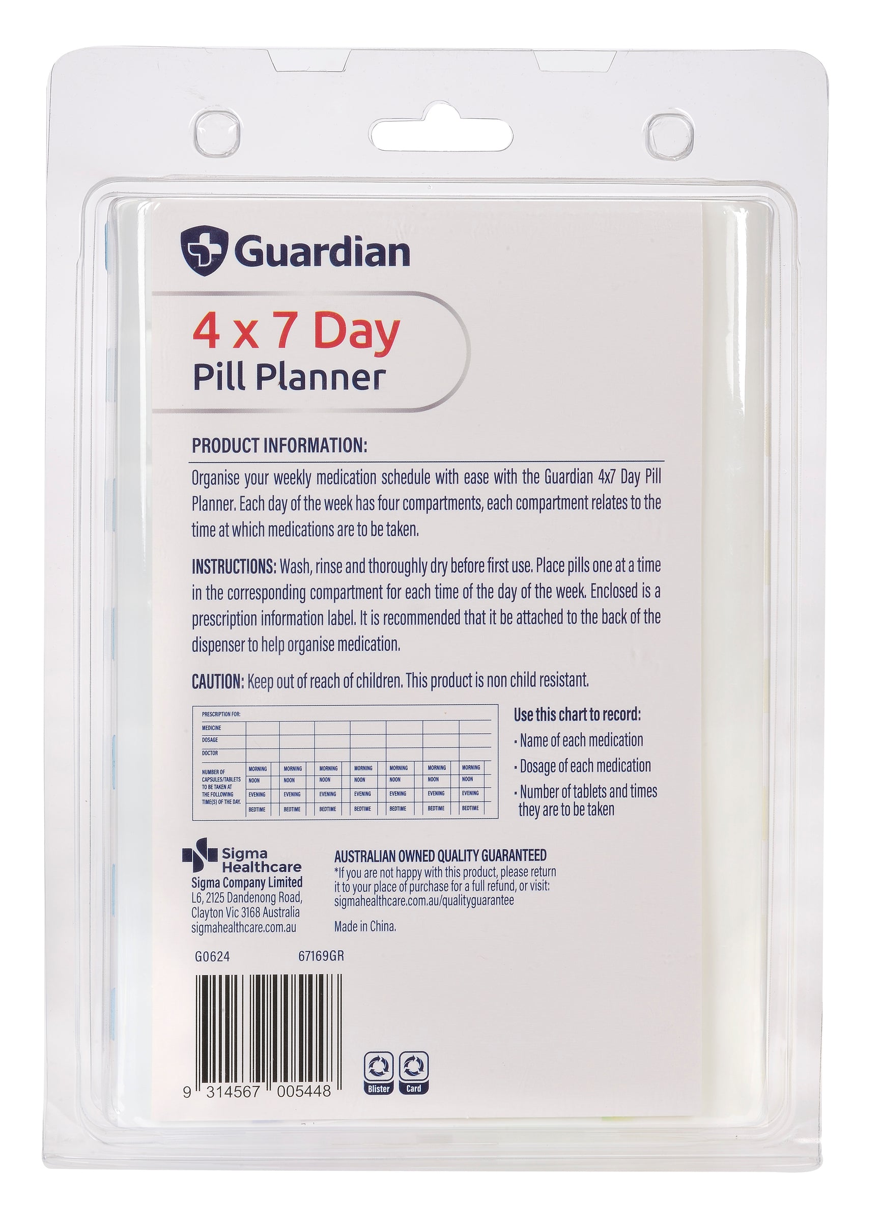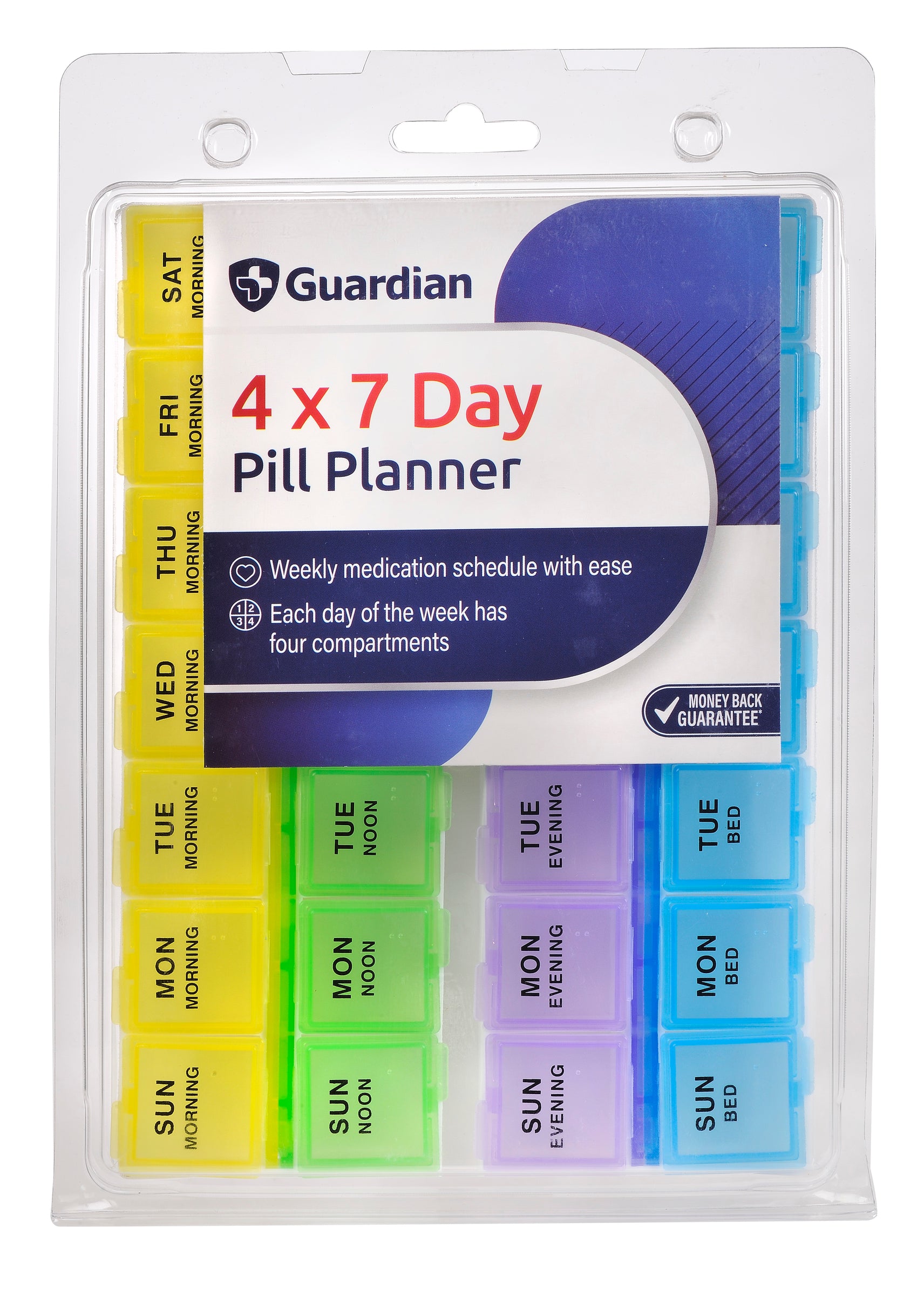 Organise your weekly medication schedule with ease with the Guardian 4x7 Day Pill Planner.