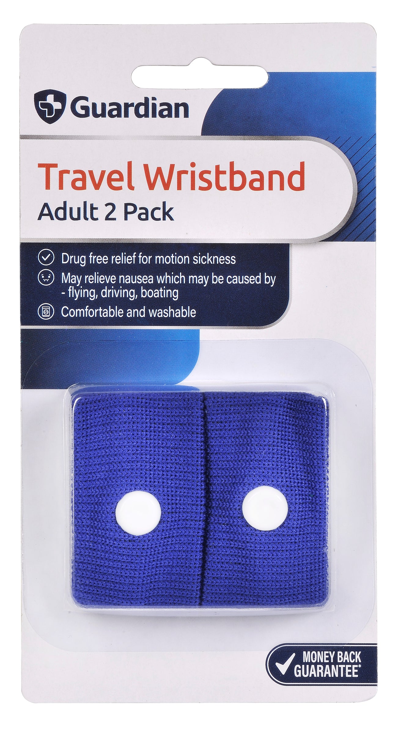 Guardian Travel Wristbands gently apply pressure on acupressure points on the underside of the wrists to relieve nausea.