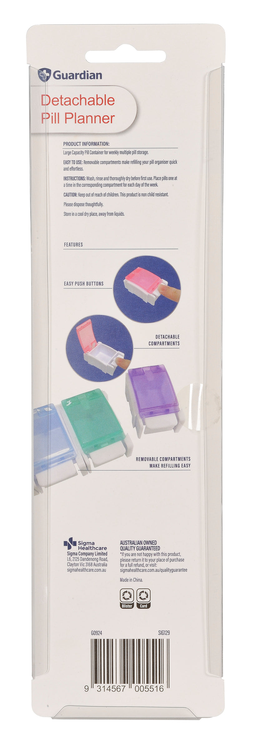 Stay organized with the Guardian Pill Planner Detachable 7 Days. Clearly labeled compartments and a detachable design for easy, on-the-go use. Perfect for managing your weekly meds!