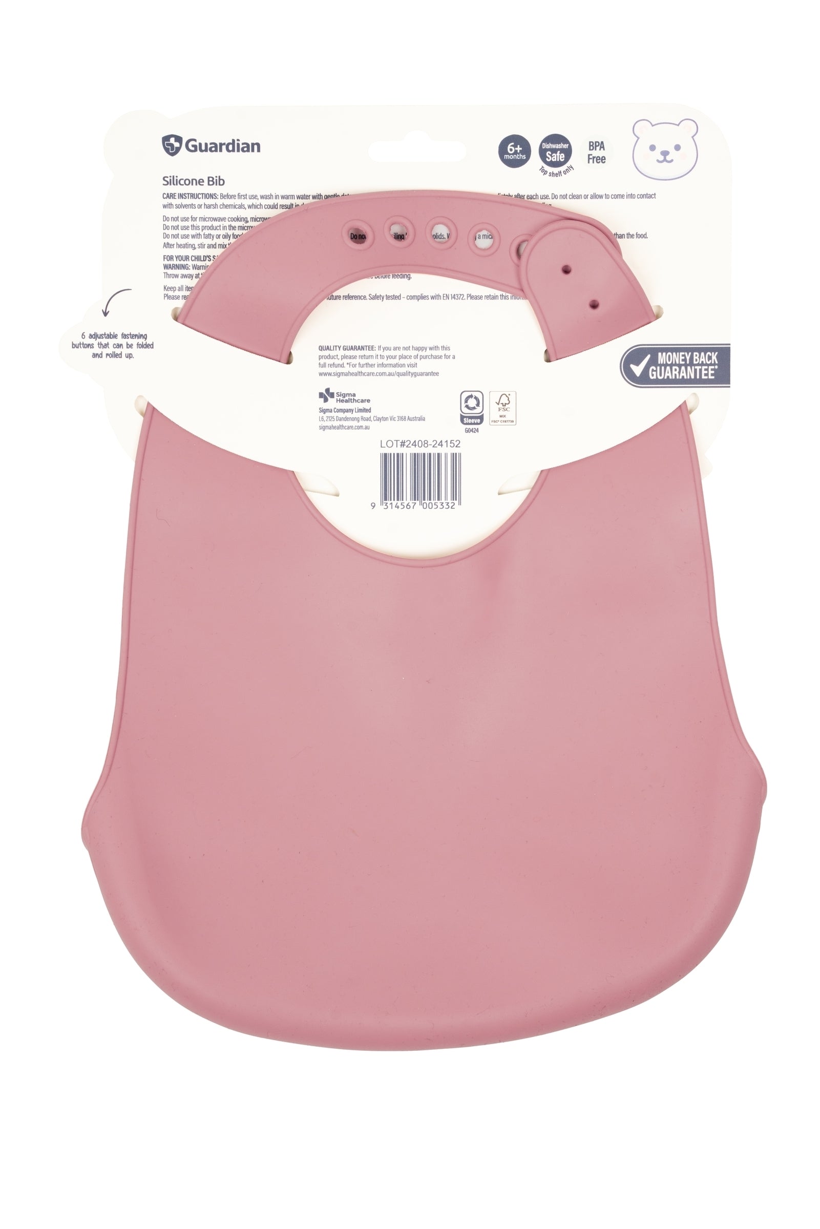 Guardian Silicone Bib features 6 adjustable fastening buttons that can be folded and rolled up.