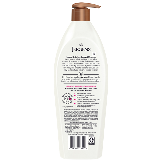 - What it isPamper yourself with Jergens Hydrating Coconut Body Moisturiser.