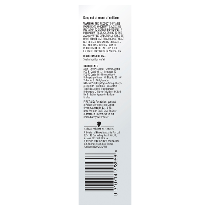 - Warning & PrecautionsThis product is not recommended for use on children under 12 years old. This product contains ingredients which may cause skin irritation to certain individuals. A preliminary test according to the accompanying directions should be made before use. This product must not be used for dyeing eyelashes or eyebrows; to do so may be injurious to the eye. Repeated exposure may cause sensitisation. Keep out of reach of children.