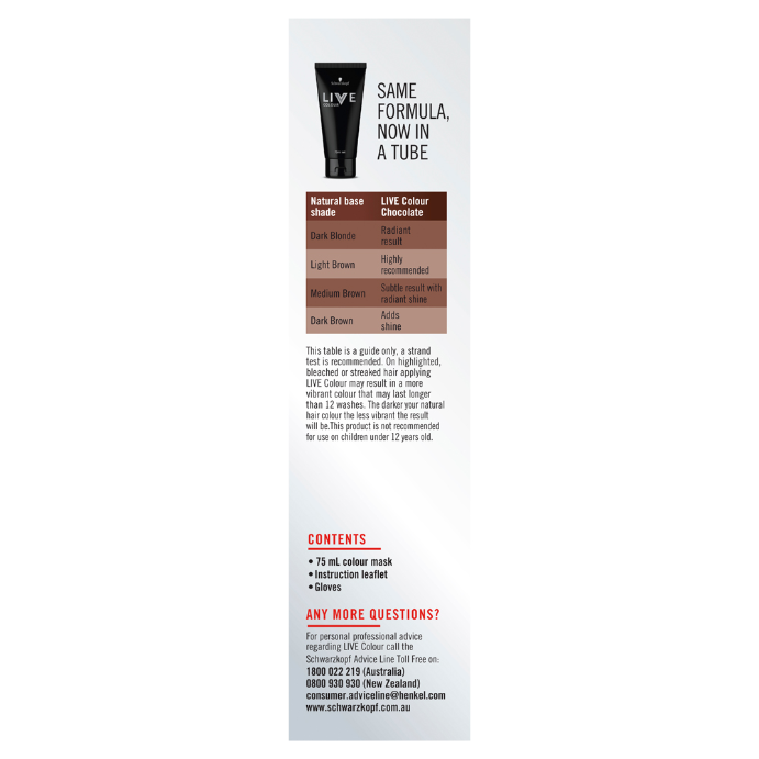 - What it isSchwarzkopf LIVE Colour Chocolate 75ml with gentle ammonia-free colour mask for superior condition, shine and rich tones.