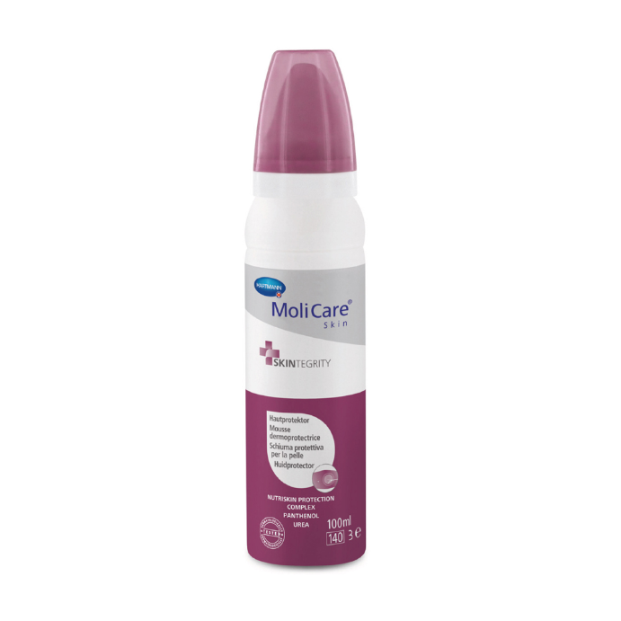 MoliCare Skin Protection Foam is an effective barrier to protect irritated skin from the effects of incontinence by forming a transparent protective film on the skin.