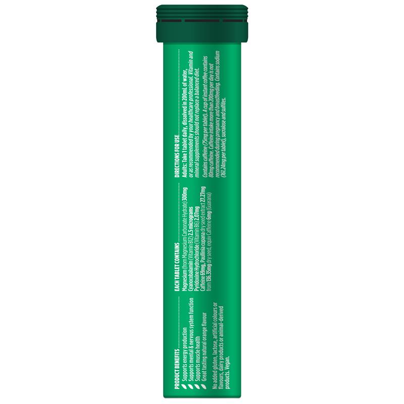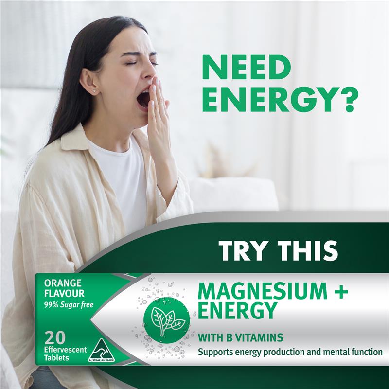 Support your body's energy production and mental function with Nature's Own Magnesium + Energy Tablets 20. Each tablet contains a blend of Magnesium, Vitamin B6, Vitamin B12, Caffeine *, and Paullinia cupana dry seed extract, which supports energy production in the body, as well supports healthy mental and nervous system function. This 1-a-day Magnesium and B Vitamin supplement also supports healthy immune system function, and maintains muscle health. Australian Made® and rigorously tested to ensure quality, potency, and purity, Nature's Own High Strength Magnesium tablets contain no added gluten, lactose, artificial colours or flavours, dairy products or animal derived products **. Adults dissolve one tablet once daily in 200ml of water, or as directed by your healthcare professional, for an effervescent, natural orange-flavoured drink that tastes great. Always read the label and follow the directions for use.* Contains caffeine (75mg per tablet). A cup of instant coffee contains 80mg caffeine. Caffeine intake more than 200mg per day is not recommended during pregnancy and breastfeeding. Contains sodium (161.24mg per tablet), sucralose and sulfites.