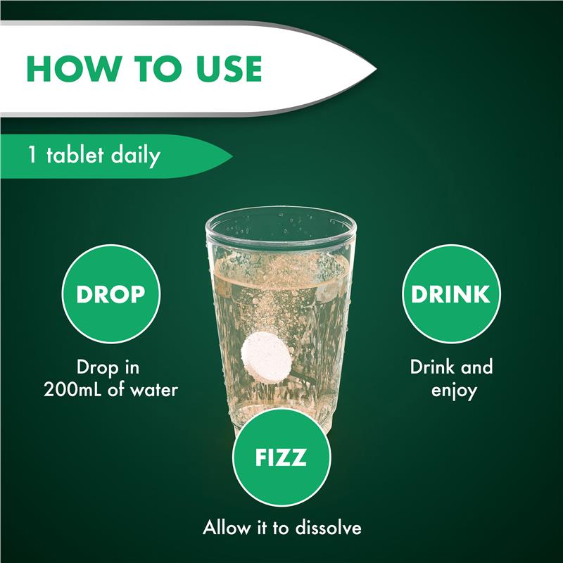 Suitable For: Take 1 tablet daily, dissolved in 200mL of water, or as recommended by your healthcare professional. If symptoms persist, see your healthcare professional.