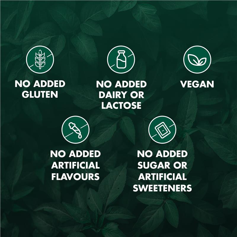 • Contains no added gluten, lactose, sugar, artificial flavours, artificial sweeteners, dairy products or animal derived products.