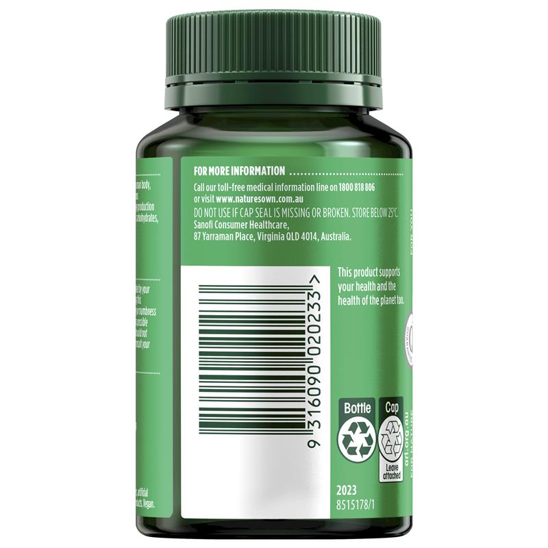 Support your body's energy production and relief of tiredness with Nature's Own Ultra B 150 Forte Tablets 60. Each tablet contains high potency formulation of Vitamin B, including the active form of Vitamin B12 found in the human body. Activated Vitamin B12 acts as a co-enzyme for metabolic reactions and supports the body's energy production system, and relieves tiredness. This 1-a-day complex Vitamin B supplement also aids the body in the metabolism of carbohydrates, fats, and proteins, as well as maintains mental function, and supports healthy nervous system function. Australian Made® and rigorously tested to ensure quality, potency, and purity, Nature's Own Ultra B 150 Forte tablets contain no added gluten, lactose, sugar, artificial flavours, artificial sweeteners, dairy products or animal derived products*. Adults, take one tablet daily with food or as recommended by your healthcare professional. Always read the label and follow the directions for use. Stop taking this medication if you experience tingling, burning, or numbness and see your healthcare practitioner as soon as possible.* Contains sulfites.