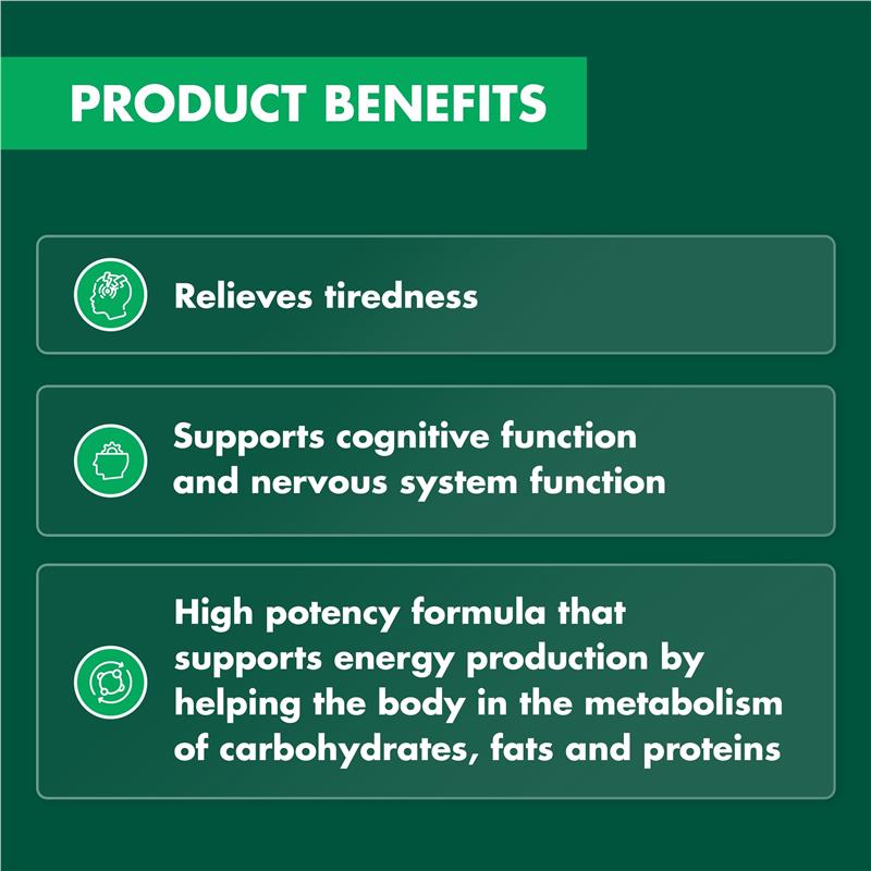 • SUPPORTS ENERGY PRODUCTION: Contains active form of Vitamin B12 found in the body, which serves as a co-enzyme for metabolic reactions and helps maintain the body's energy production• SUPPORTS METABOLISM & DIGESTION: High-potency Vitamin B formula helping the body in the metabolism of carbohydrates, fats and proteins