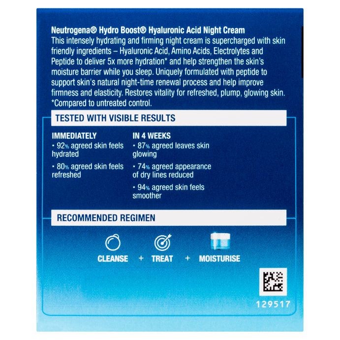 - What it isNeutrogena Hydro Boost Hyaluronic Acid Night Cream. This intensely hydrating and firming night cream is supercharged with skin-friendly ingredients - Hyaluronic Acid, Amino Acids, Electrolytes and Peptide to deliver 5x more hydration* and help strengthen the skin's moisture barrier while you sleep. Uniquely formulated with peptide to support skin's natural night-time renewal process and help improve firmness and elasticity. Restores vitality for refreshed, plump, glowing skin.