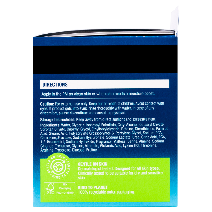 What it doesThis intensely hydrating and firming night cream is supercharged with skin-friendly ingredients - Hyaluronic Acid, Amino Acids, Electrolytes and Peptide to deliver 5x more hydration* and help strengthen the skin's moisture barrier while you sleep. Uniquely formulated with peptide to support skin's natural night-time renewal process and help improve firmness and elasticity. Restores vitality for refreshed, plump, glowing skin.