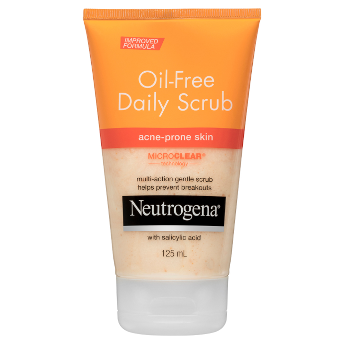 - What it isNeutrogena Oil-Free Daily Scrub Acne-Prone Skin is a multi-action gentle scrub helps prevent breakouts with salicylic acid.