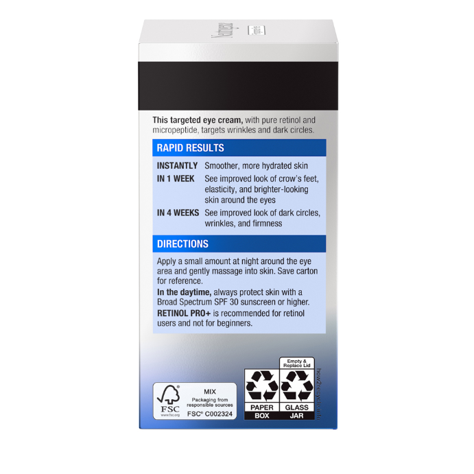 - What it doesFor an experienced user, Neutrogena Retinol Pro+Eye Cream targets wrinkles and dark circles and provides rapid results. With 0.05% Pure Retinol, a form of Vitamin A and a dermatologist-proven powerhouse ingredient, and Micropeptide, that complements retinol and targets the visible effects of collagen-depleted skin.