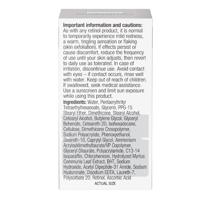 - Warning & PrecautionsAs with any retinol product, it is normal to temporarily experience mild redness, a warm, tingling sensation or flaking (skin exfoliation). If effects persist or cause discomfort, reduce the frequency of use until your skin adjusts, then revert to daily use as tolerated. In case of irritation, discontinue use. Avoid contact with eyes - if contact occurs, rinse well with water. Keep out of reach of children. If swallowed, seek medical assistance. Use a sunscreen and limit sun exposure while using this product.